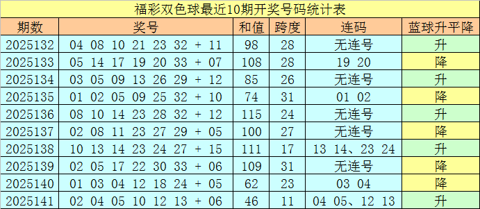 上期开奖:福彩双色球第2025141奖号开出:02 04 05 10 12 13 + 06,红球号码和值为46,首尾间距为11,包含连号:04 05、12 13。